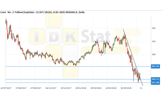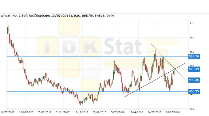 Прогнозы по урожаю пшеницы в Европе снижаются. Отчет USDA 12-го июля в этом свете будет очень интересен. Сейчас независимые агентства анонсируют падение урожая пшеницы в Германии и во Франции. Европа может «провалиться», уровни все же достаточно высоки, поэтому приходится использовать кавычки, по сравнению с прошлым годом на 20 млн. тонн, что связано с сухой и холодной весной в Германии и сильными ливнями в весенний период в ряде регионов Франции. Негативный фон, по ожидающимся объемам, поддержал на прошлой неделе цены на пшеницу. В складывающихся обстоятельствах, мы ждем роста котировок к 540.0 центов за бушель.