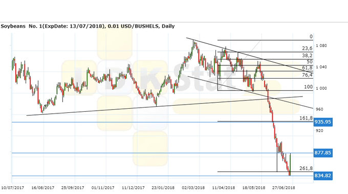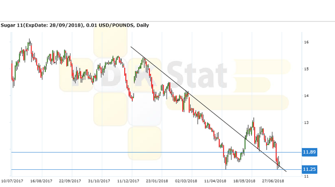 Сценарий роста: рассматриваем июльский фьючерс, дата экспирации 13 июля. Впечатляющий рывок в пятницу. Рынок перепродан, это было видно, но история с Китаем держала его в напряжении. На фоне запретительных пошлин для американской сои Бразилия станет импортером данной продукции из США, так как если все сырье отправится в Китай местным переработчикам нечем будет загружать собственные мощности. Результатом осознания данного факта и стал столь впечатляющий рывок вверх.