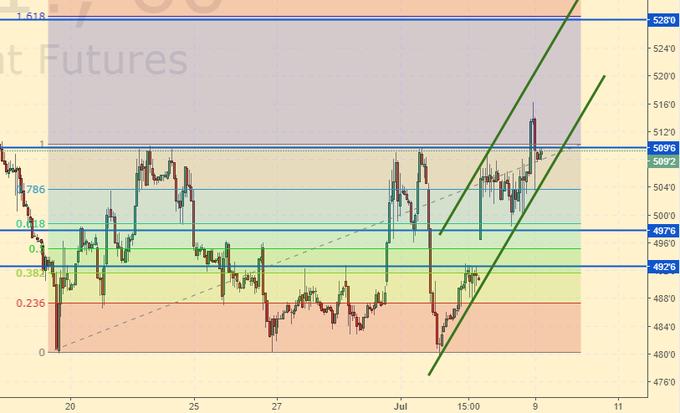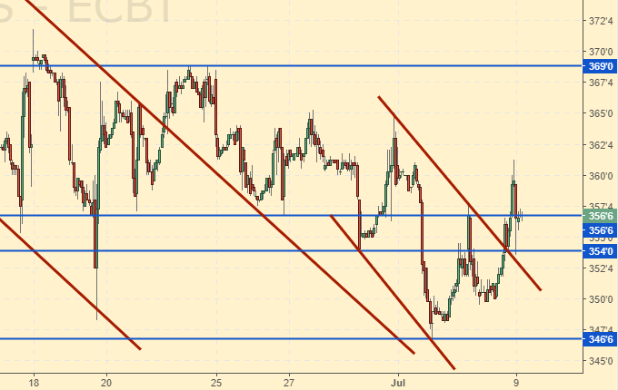 Кукуруза: да-да-да. Кукуруза продолжает рисовать нам восходящий импульс, что обнадеживает быков. Надо покупать. Ситуация по кукурузе несколько лучше чем по пшенице, с точки зрения будущего урожая, поэтому сильного роста не ждем, но восстановление к 400.0 выглядит разумно.