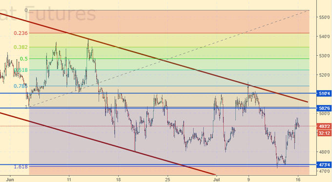 Пшеница: здесь тянет продать с коротким стоп-ордером пока мы ниже 500.0. Урожай солидный прогнозируют, что не должно дать ценам расти, да и кукуруза на заднем плане продолжает тихо помирать не в силах оторваться от 340.0. Покупать пшеницу рекомендуем только после роста цен выше 516.00.