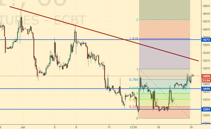 Кукуруза: покупка от 339.0 продолжает жить и доставлять удовольствие. Если мы действительно как-то доберемся до 430.0, то получим прибыль/риск 90 (девяносто) к 1. Пяток таких трендов и вот вы уже в Forbes. Посмотрим, что же будет в реальности.