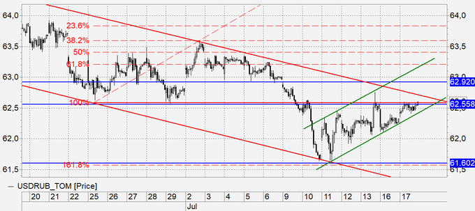 Рубль: нефть приседает, рубль следует за ней. Сегодня есть угроза ослабления копеек на сорок. Если мы откроемся выше 62.50, то к полудню можем быть на 63.00. Далее небольшой откат. Если нефть не опомнится, то пройдем на 64.00.