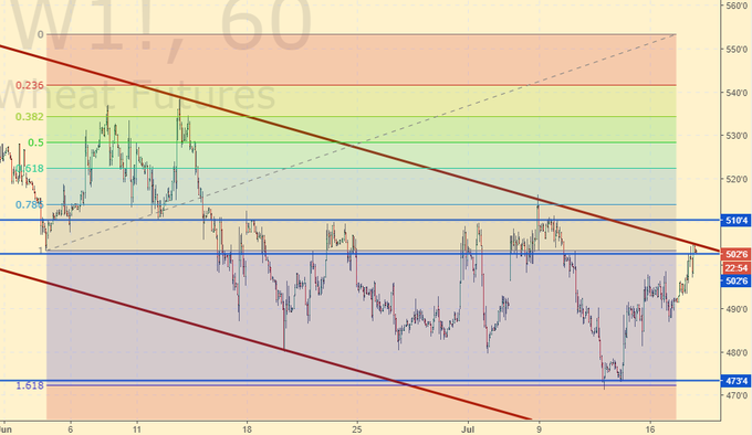 Пшеница: для того, чтобы мы купили, цена должна выйти из падающего канала и поняться выше 515.0. Рынок ведет себя по-летнему вяло, вследствие чего получить от него прибыльный тренд крайне непросто. Не хочется думать, что мы продолжим находиться в ценовом болоте, но морально к такому развитию событий нужно быть готовым.