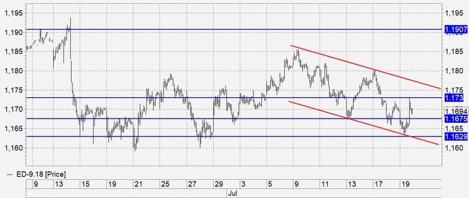 Евро: сложно посреди лета и накануне объявления решения по ставке в Еврозоне (26 июля), предъявлять претензии рынку о том, что он не двигается. Итоги по инфляции за июнь подведены, и она составляет 2%, что должно обеспокоить банкиров, так как существует риск разгона данного показателя. Значит, надо повышать ставку. Если решение ЕЦБ будет радикальным (+0,25%), то мы можем увидеть 1.2100 очень быстро.