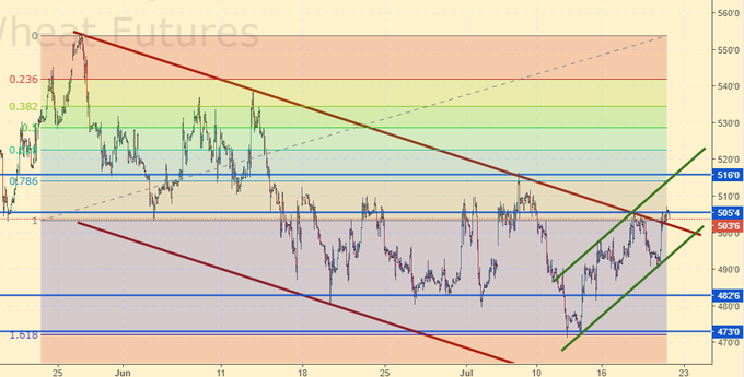 Пшеница: потихоньку пшеница залезла выше падающего канала. Теперь мы держимся немного выше 500.0, и стараемся смотреть в будущее. Учитывая весьма сложную картину для анализа, все же попросим рынок подняться выше 515.0, и лишь после этого осторожно (с малым риском) войдем в лонг со своими деньгами.