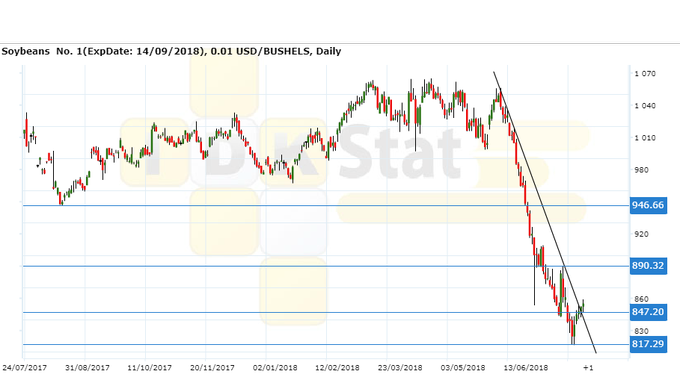 Сценарий роста: рассматриваем сентябрьский фьючерс, дата экспирации 14 сентября. Даже если торговая война между США и Китаем продолжится, то соя не будет затронута. Она уже под санкциями. Видим небольшой рост, который обусловлен тремя факторами: хорошим внутренним спросом на соевое масло в США, расширением программы производства биодизеля, падением урожая подсолнечника в России и Украине на 2 млн. тонн. Таким образом, восстановление к 950.00 выглядит оправданным.
