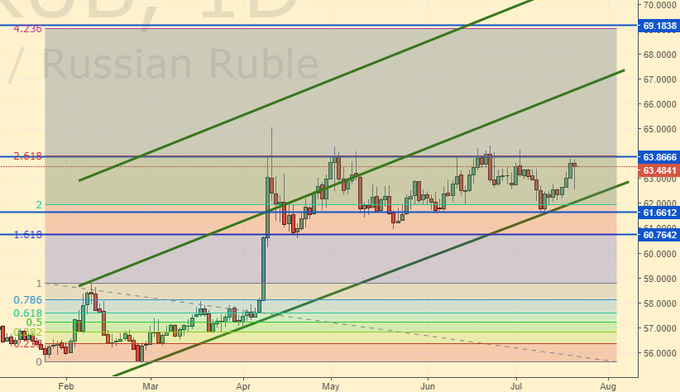 История с рублем пока еще не начала восприниматься в негативном ключе. Для того чтобы мы поверили в 70.00 надо брать 64.00. Случится это может уже в понедельник, так как рынок начал отыгрывать слухи о возможном запрете покупки долга РФ иностранными банками. Пока доля нерезидентов в нашем долге составляет 30.5% процентов. За месяц доля уменьшилась на 2%, это не критично, но все в руках Вашингтона, и их «голубая мечта» заключается в том, чтобы спровоцировать массовый исход из наших бумаг. Если ставка 1-го августа будет снова поднята ФРС США, то желающих получать премию за риск станет меньше и отток инвесторов с российского рынка продолжится.