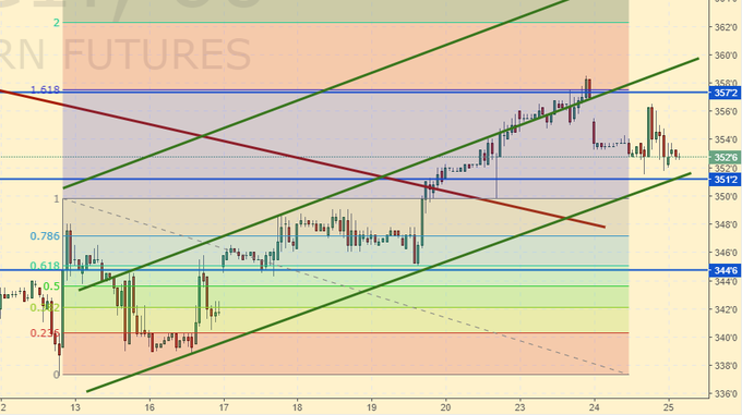 Кукуруза: видим некоторые сомнения в возможности продолжения роста, но единичные продажи в середине восходящего канала не способны переломить тенденцию. В текущем районе (353.0) можно как покупать, так и наращивать лонги с первоначальной целью на 370.0.