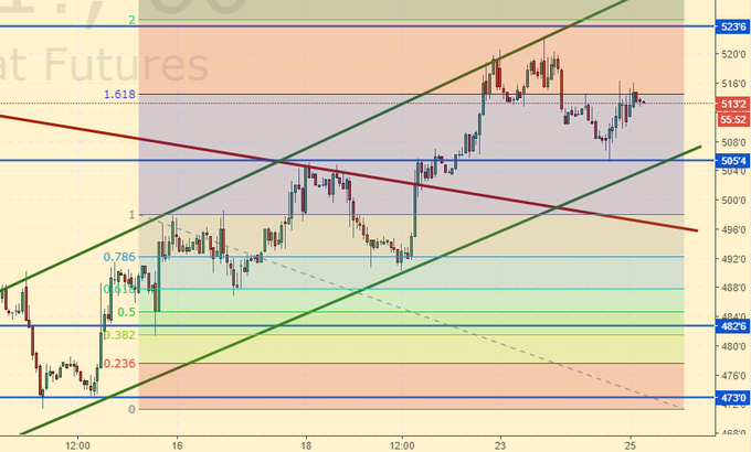 Пшеница: прекрасное касание на 505.0 и отскок. Пшеница продолжает нам рисовать восходящий канал. Похоже, объемы урожая в Европе все-таки придется пересматривать в сторону понижения. С технической точки зрения на рынке пшеницы все красиво. Пока нет никаких сомнений, что мы идем на 540.00.