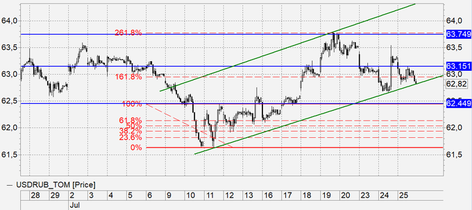 Рубль: поскольку нефть пока удержалась в седле, рубль не торопится падать. Укрепление национальной валюты возможно лишь в одном случае: 1-го августа ФРС США дрогнет, и повышения ставки не последует. Тогда, вся товарная группа, в том числе и нефть продолжит рост на ослаблении доллара, что придаст рублю дополнительных сил.