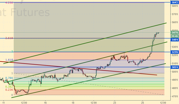 Пшеница: приятно сознавать, что наша борьба за светлое будущее торговых счетов оказывается весьма полезной. Пшеница вылетела вверх, что означает весьма неплохие прибыли для тех, кто уже несколько дней держит контракты на покупку. Пробой уровня 540.0 был однонаправленным и быстрым, что дает основания полагать, что мы идем на 585.0. можно закрыть 20% позиции, остальное держим.