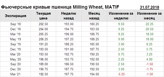 На 31.07.2018 стоимость пшеницы Milling Wheat на бирже MATIF по контракту Sep ’18 составила 202.5 евро за тонну. За прошедшую неделю стоимость пшеницы Milling Wheat выросла на 9.5 евро/тонна. Как мы видим на графике, фьючерсная кривая имеет периоды, когда более дальний фьючерс дешевле ближнего. Состояние бэквардации наблюдаем на следующих контрактах: Sep ’19, Sep ’20. Таким образом, трейдеры предполагают, что возможно превалирование предложения над спросом в указанные периоды.