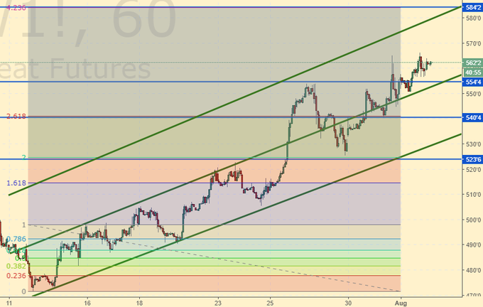 Пшеница: котировки пока признаков замедления не показывают, мы с высоко поднятой головой идем к 585.0. Это просто отлично, так-как там у нас и цель, и деньги уж готовы для шорта. Если затея сработает, это станет отличным подарком самим себе к середине сентября. Именно в середине первого месяца лета мы увидим новый минимум. Вариант роста рынка выше 585.0 не рассматриваем,так-как назревает перекупленность, Хотя бы откат от данного уровня мы увидеть должны.