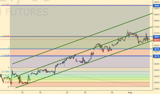 Кукуруза: сравнивая поведение пшеницы и кукурузы можно сделать вывод не в пользу последней. Да, мы пока в растущем канале, но большой инициативы идти к 390.0 пока не видно. Вероятно, нас ждет коррекция к 360.0, поэтому рекомендуем подтянуть стоп ордера едва ли не вплотную, на 366.0.