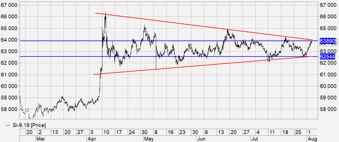 Рубль: нехорошо так писать, но все же есть смысл продолжить. Итак, у нас август. Рубль замер у последней черты. Черта находится на 64.00. А с точки зрения технического анализа на 63.80. На фоне внесения законопроекта в конгресс США об усилении санкций против РФ мы можем уже в первые два часа торгов сегодня отоварить всех страждущих спекулянтов – банкиров. Это все очень плохо выглядит структурно. Банки санировались, в них наливались деньги. Новые деньги отправляются на рынок за долларами и складываются на счетах или в наличном виде. Далее, никто ничего не делает, реальный сектор не кредитуется, экономика не развивается, и как результат последних четырех лет (сыр из пальмового масла, например) мы сегодня – завтра рискуем получить новый виток падения национальной валюты.