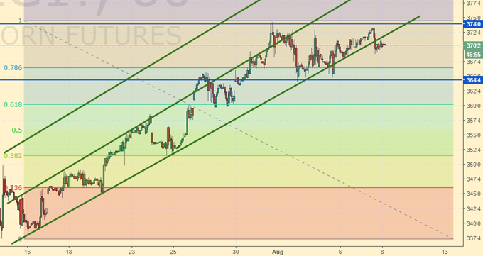 Кукуруза: нас настигла неприятная стабилизация, да еще и с выходом из растущего канала. Это может привести к продолжению падения, что еще вчера не просматривалось. Есть ощущение, что рынок решил подождать отчета USDA 14-го августа, прежде чем расти выше.
