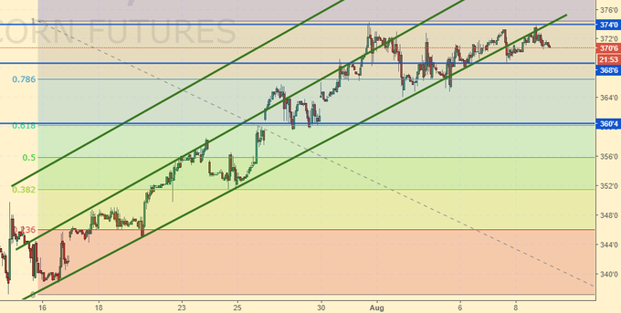 Кукуруза: пока мы не поднялись выше 375.0, есть возможности для продаж с целями на 360.0, так как текущая коррекция не выглядит завершенной. Если мы сегодня поднимемся выше 375.0, то это откроет дорогу к 400.0, чем можно пользоваться на «часовках». Но покупка от 360.0 смотрелась бы куда лучше. Если рынок припадет, и даст нам возможность купить от данного уровня, надо ей воспользоваться.