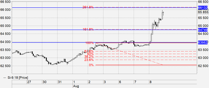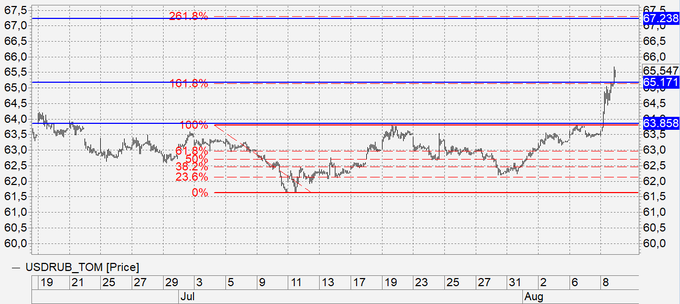 Рубль: немного мы не попали в темп, с нашими оценками. Это практически никак не повлияло на результат, так как обозначенные нами вчера утром стоп-ордера сбиты не были (63.38 по TOM и 63800 по сентябрьскому фьючерсу), а было бы очень неприятно, если бы их уничтожили и пошли выше. Но ничего такого не произошло, и вот мы наконец вылетели. Время, первая декада августа, самое зловещее за последние годы для экономики РФ. Куда? На 69.00. Будет небольшое замешательство на 67.00. Если последуют ответные действия со стороны РФ, главное, чтобы они не были громко анонсируемы, так-как это приведет к еще большей скорости ухудшения ситуации. Если уровень 70.00 будет взят в рамках данного подъема без отката, на рынке начнется паника образца января 16-го года.