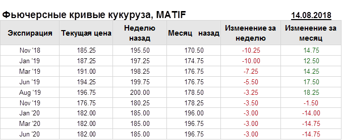 На 14.08.2018 стоимость кукурузы на бирже MATIF по контракту Nov ’18 составила 185.25 евро за тонну. За прошедшую неделю стоимость кукурузы на европейской площадке упала на 10.25 евро/тонна. Как мы видим на графике, фьючерсная кривая имеет периоды, когда более дальний фьючерс дешевле ближнего. Состояние бэквардации наблюдаем на следующих контрактах: Nov ’19. Таким образом, трейдеры предполагают, что возможно превалирование предложения над спросом в указанные периоды.