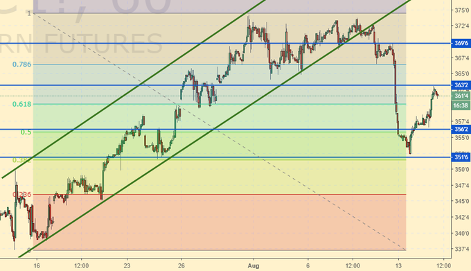 Кукуруза: прогнозируемо поднялись к 360.0. От данного уровня нужно было продавать, о чем писалось, для того чтобы попытаться отработать сценарий падения стоимости кукурузы до 300.0. Отметим, что движения носят весьма дерганный волатильный характер, что затрудняет построение верных гипотез с периодичностью раз в сутки. Фундаментальную поддержку данному рынку оказывает возросшая оценка потребления кукурузы, которая незначительно, на 10 млн. тонн, но все же превышает предполагаемый объем урожая.