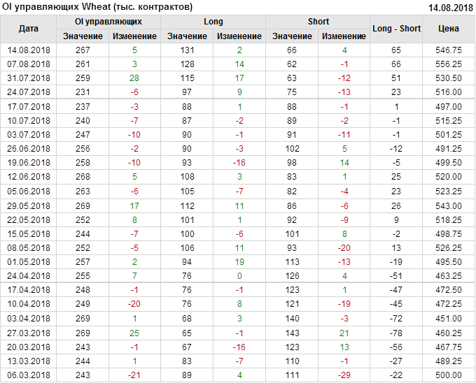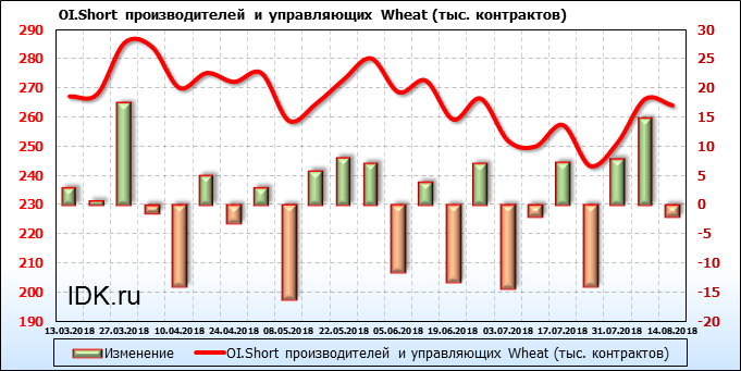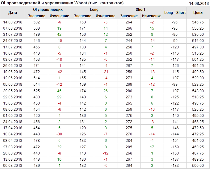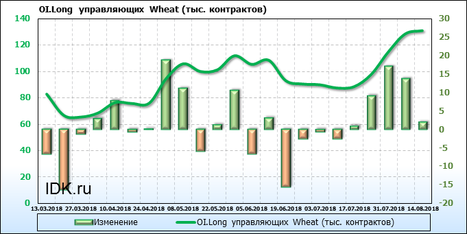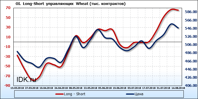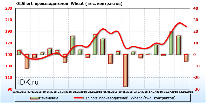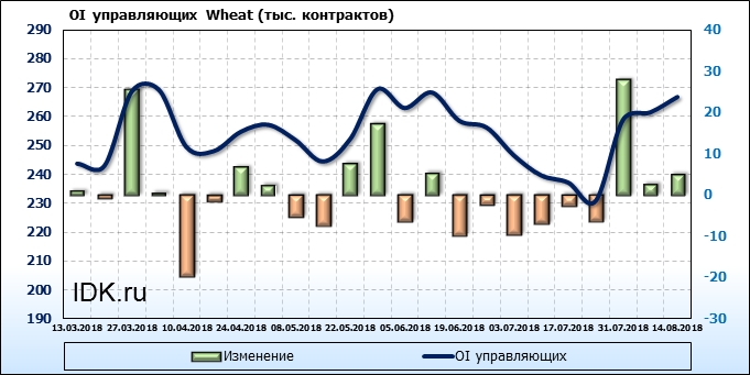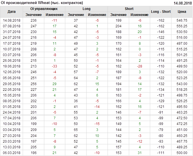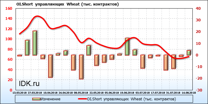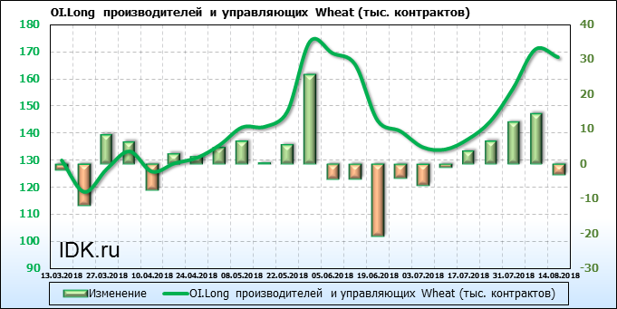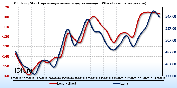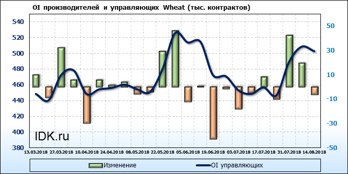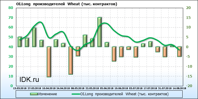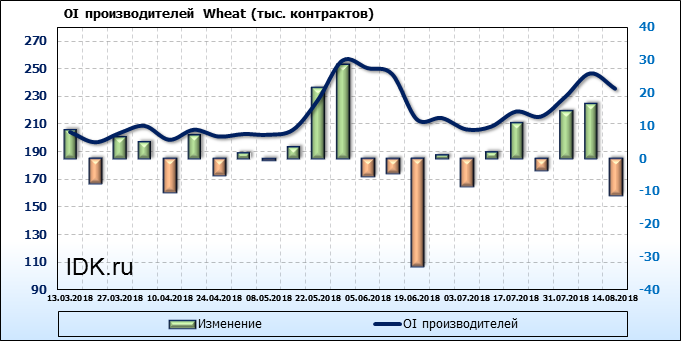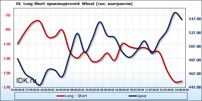 За прошлую неделю, 06.08.18 — 10.08.18, разница между длинными и короткими позициями производителей выросла на 0 тыс. контрактов. В тоже время, цена упала на 9.5 цента. Производители перестали наращивать короткие позиции, что говорит или о непривлекательности текущих ценовых уровней для хеджирования, или о том, что часть участников рынка заняла выжидательную позицию.
