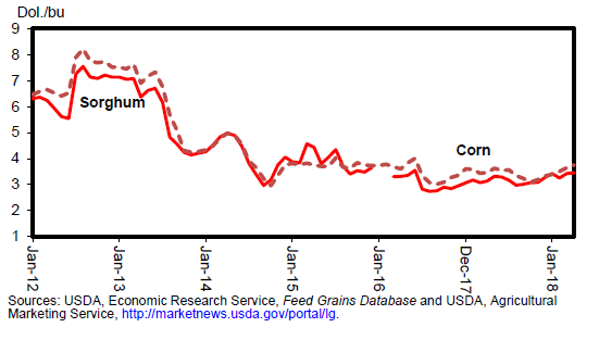 Прогнозируемые конечные запасы составляют 39,7 млн. бушелей, что на 4,4 млн. больше, чем в прошлом месяце. Прогнозируемая средняя цена на сорго, получаемая фермерами в 2018/19 году, снижена на 0,20 доллара США на каждом конце диапазона от 2,90 до 3,90 долл. США за бушель со средним значением в 3,40 долл. США за бушель. Для 2017/18 года этот диапазон не изменился и составляет от 3,15 до 3,25 долл. США, со средним значением на прежнем уровне в 3,20 долл. США за бушель.