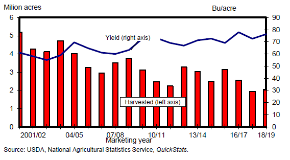 Рисунок 9. Уборочная площадь и урожайность ячменя в США.