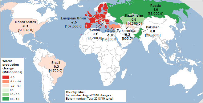 Карта 1. Изменения производства пшеницы на 2018/19 год (млн. тонн), август 2018.