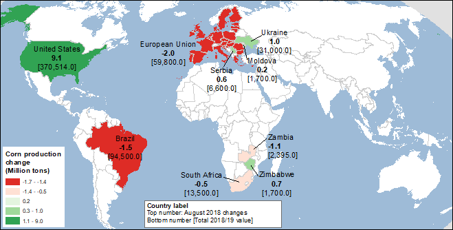 В этом месяце мировая торговля кукурузой на 2018/19 год увеличена на 0,9 млн. тонн до 156,0 млн., способствующим этому фактором является значительное сокращение бразильского урожая кукурузы, причем Бразилия снижает экспорт на 3,0 млн. тонн. Соединенные Штаты, с их увеличенной оценкой производства меняют эту тенденцию, увеличивая объем торговли на 2,5 млн. тонн кукурузы. Импорт кукурузы в ЕС повышен на 2,0 миллиона тонн, чтобы компенсировать падение запасов пшеницы и кукурузы в ЕС. Кроме того, экспорт кукурузы из Украины увеличен на 0,5 млн. тонн при ожидаемом увеличении урожая в 2018-19 году.