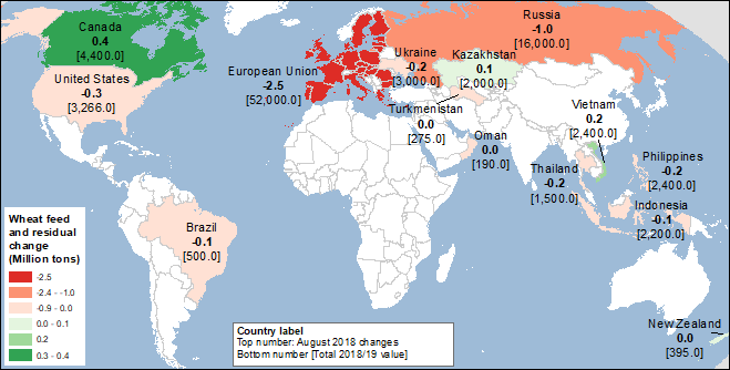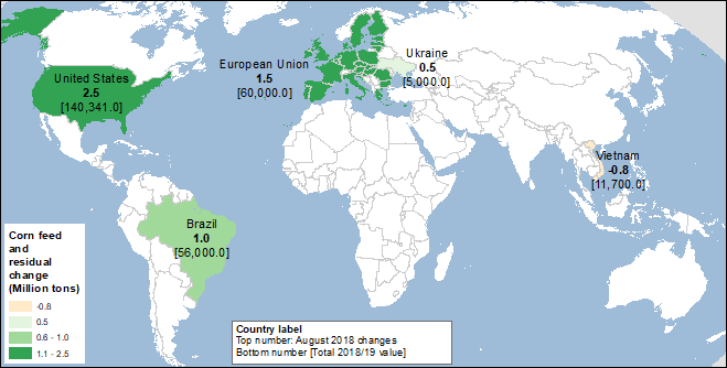 Кормовое и остаточное использование для четырех кормовых зерновых (кукуруза, сорго, ячмень и овес) и пшеницы на сезон 2018/19, для маркетингового года с сентября по август, прогнозируется на уровне 148,0 млн. метрических тонн, что на 2,3 млн. больше прогноза прошлого месяца, равного 145,7 млн., и на 4,5 млн. больше, чем 143,5 млн. в 2017/18 году. Рост кормового использования кукурузы в сочетании с сокращением кормового использования пшеницы ответственны за изменение с прошлого месяца.