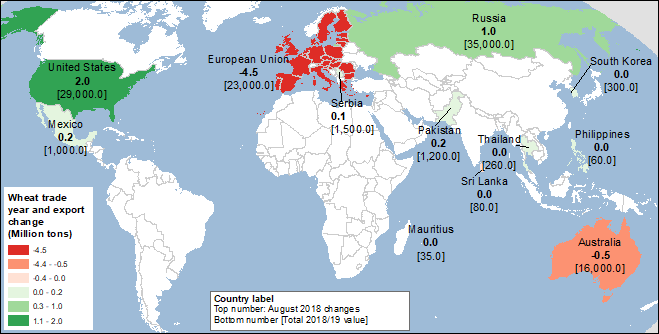 Карта 5. Изменения в торговле пшеницей на 2018/19 год, август 2018.