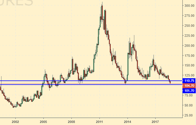 Сценарий роста: рассматриваем сентябрьский фьючерс, дата экспирации 18 сентября. Как интересно. Никакого роста выше 111.50 мы не увидели. Всё упало. И продолжает падать. На этом графике одна свеча равна одному месяцу. Если мы пробьем 100.00, то ниже… например 75.00. Приходится гадать, так как после 100.00 никаких опорных уровней нет.