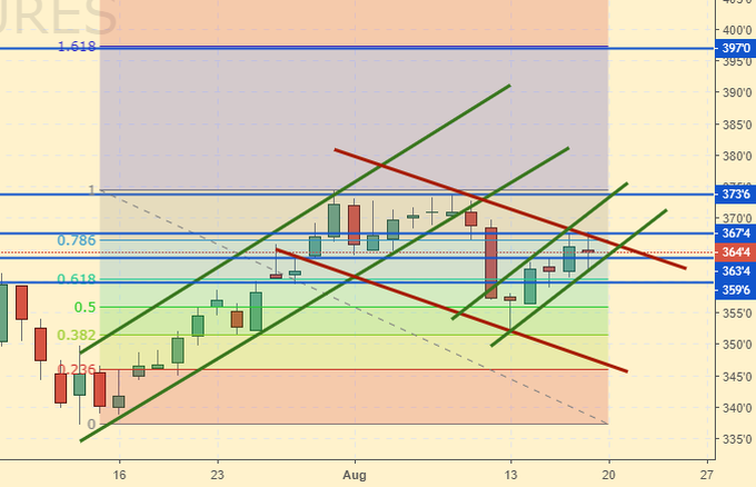 Сценарий падения: а вот и нужный нам откат к 365.0. Здесь можно агрессивно продать, поставив стоп на 371.0. Пока верим, что рынок может уйти к 300.0.