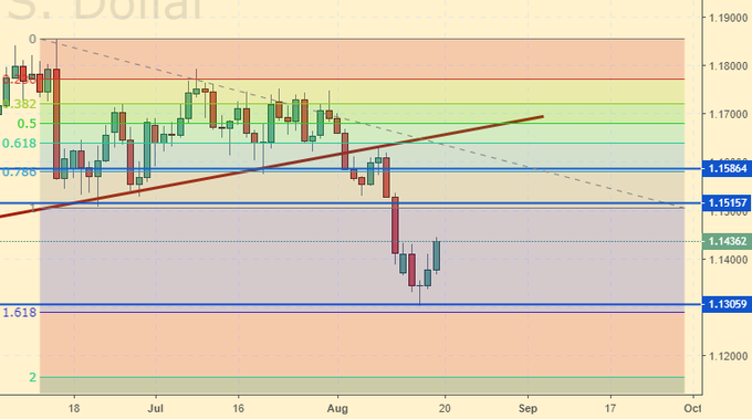 Сценарий роста: 22-го августа ждем первый из новых, пока показательный, пакет санкций со стороны США. Запрет на покупку электроники двойного назначения и еще по мелочи. А вот 22-го октября, все будет намного хуже. Но до той даты время еще есть. И тем не менее, рубль в складывающейся ситуации не должен ослабнуть выше 80.00. Пока у нас есть время для хода к 64.00. Если отката не будет, это плохо. Значит, мы ускоренными темпами пойдем к 80.00, что предполагает легкую панику живущих вне рынка масс.
