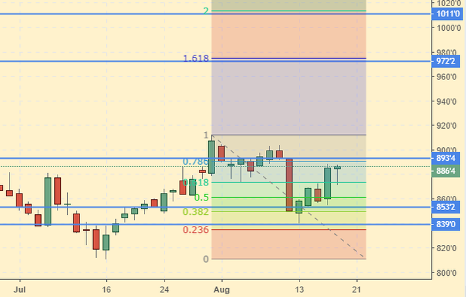 Сценарий падения: а вот тут пока стоп на 890.0 стоит. Так обычно не делают, но здесь надо побороться, мы отодвинем стоп на 914.0 и нарастим позицию на продажу, которая открыта от 880.0. То, как мы закончили неделю в пятницу, это просто прямое приглашение к продаже. Воспользуемся им.