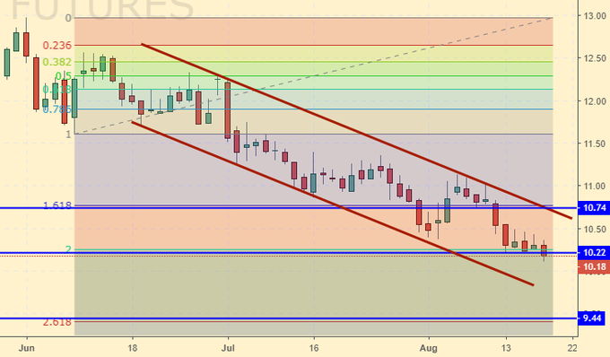 Сценарий роста: рассматриваем октябрьский фьючерс, дата экспирации 28 сентября. Похоже, рынок отправился на 9.44. Раз так, то подождем его там и купим. Страны, в которых производится сахар, могут подкручивать свою валюту против доллара до бесконечности, что может обернуться вечным падением цен…