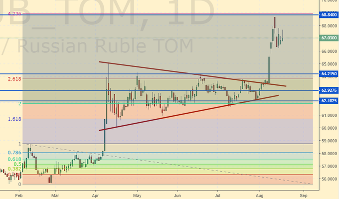 Цель у нас стояла на 68.90, простите, что не до копейки озвучено было, но все ж надеемся на вашу прозорливость на моменте тоже. Надеемся, что профит в понедельник был взят. Теперь подождем откат к 65.00 (64.00). В случае роста выше 69.00 придется брать на максимумах, так как вверху еще масса всего интересного.