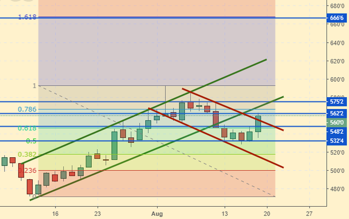 Сценарий роста: рассматриваем сентябрьский фьючерс, дата экспирации 14 сентября. Конечно, развернуться отсюда вниз рынок может. Шанс не велик, но он есть. Поэтому, если вы еще не купили, ждите хода выше 563.0, что однозначно поубивает всех медведей и мы спокойно полетим на 666.6.