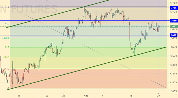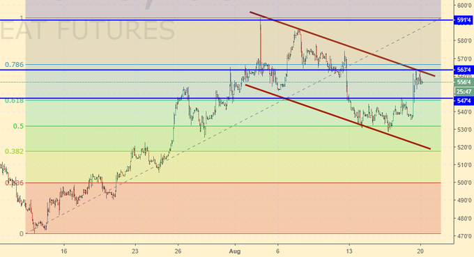 Кукуруза: нужен рост выше 370.0. В противном случае, на фоне обильного урожая (1064 млн. тонн) цены могут нырнуть на 300.0 на фоне уже состоявшегося обвала 10-го августа. Ближайшая пара дней будет показательна. Если покупатели ничего не смогут предложить рынку (пройти выше 370.0) мы отправимся вниз.