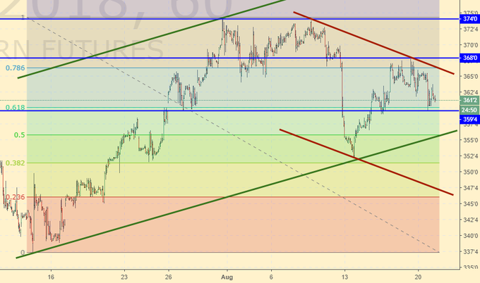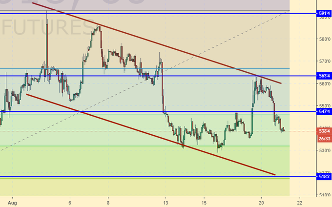 Пшеница: понедельник дал нам ответ на вопрос, заданный в пятницу. Рост – это блеф. Мы продолжаем падать уже во вторник утром в Азии, и отметка 520.0 после неудачи взятия быками 570.0 становится реальностью. Пока все выглядит достаточно невинно, и мы вроде как находимся в рамках коррекции, но стоит нам опустится ниже 520.0, как многие зададутся вопросом почему же мы не продавали от 570.0. Только не мы, мы продали вчера на открытии рынка. Идея пробоя 520.0 на фоне нового урожая будет основной в ближайшие пару дней.