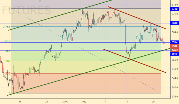 Кукуруза: мы кое-как ушли под 360.0. В теории остаются шансы на восстановление, но если и покупать, то только после роста выше 370.0. Пробой вниз уровня 355.0 подтвердит желание быков протолкнуть рынок к новым минимумам года. Поэтому, при пробое 355.0 можно нарастить объемы продаж.