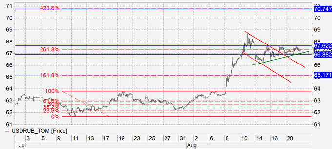 Рубль: вечером сегодня ждем официального объявления вступления в силу новых санкций США против РФ. В принципе, если нефть возьмет 73.20 и пойдет вверх, то данные санкции не повлияют на ситуацию, и мы сходим к 65.00 (64.00). ЦБ вновь скупает валюту не смотря на высокий курс доллара, что вызывает некоторое недоумение. Различные «бюджетные правила» иногда нужно уметь задвигать под ковер. А так, сохраняется риск, что мы будем падать даже при растущей нефти и профицитном бюджете. Происходящее не совсем понятно. Если коррекция отработает как надо (мы упадем к 65.00) – купите.