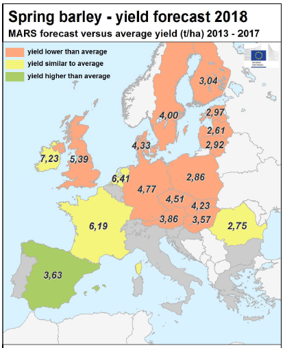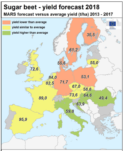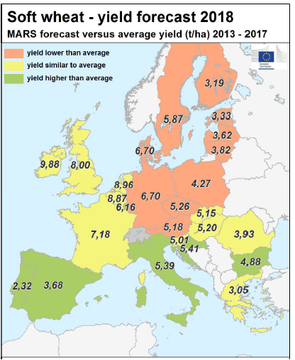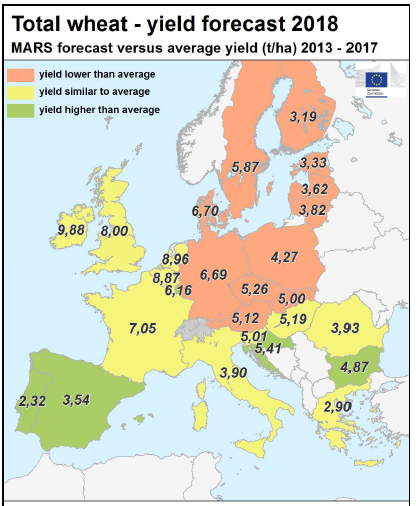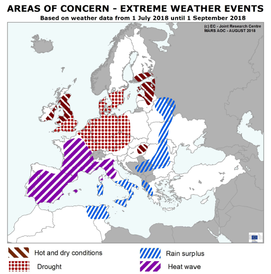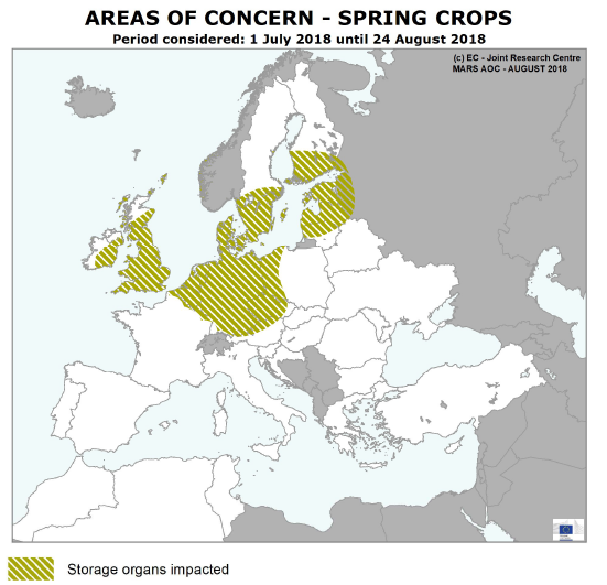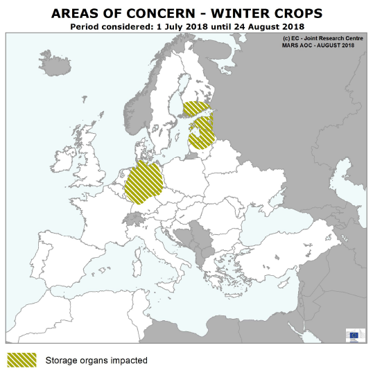 Засушливые условия сохранялись на юге Соединенного Королевства, в Германии, Дании, Швеции, странах Бенилюкса, Западной Польше, Чешской Республике и северной Австрии до (или после окончания) сбора урожая озимых и яровых культур. В результате раннее завершение фенологического цикла с последующим сокращением периода наполнения зерна стало причиной дальнейшего снижения ожидаемой урожайности. Летние культуры испытали негативное влияние на поздних вегетативных стадиях в этих странах, где концентрируется большая часть производства сахарной свеклы, картофеля и зеленой кукурузы в ЕС.