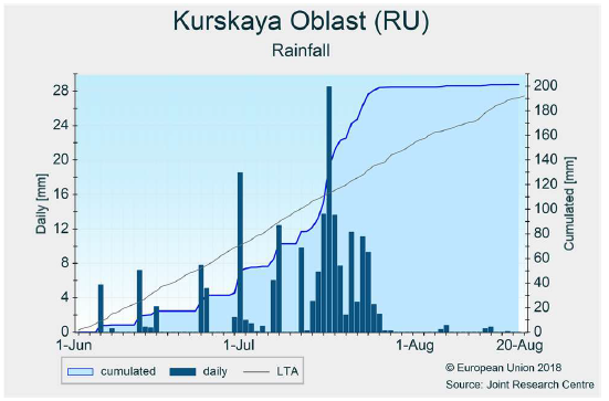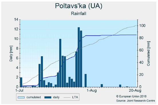 В течение рассматриваемого периода в европейской части России наблюдалась более теплая, чем обычно, погода с температурными аномалиями в основном в диапазоне между 1 и 3 ° C в южных регионах и вдоль казахской границы. Первая половина июля и период с 25 июля по 7 августа были чрезвычайно теплыми в этих регионах, а количество жарких дней (Tmax> 30 ° C) превышало среднее значение на 6-18 дней.
