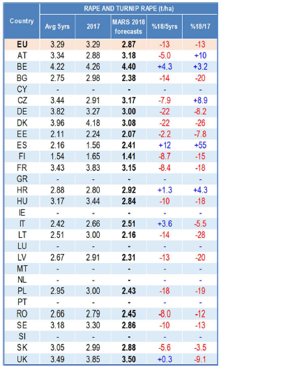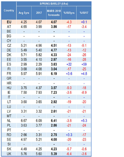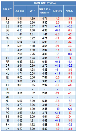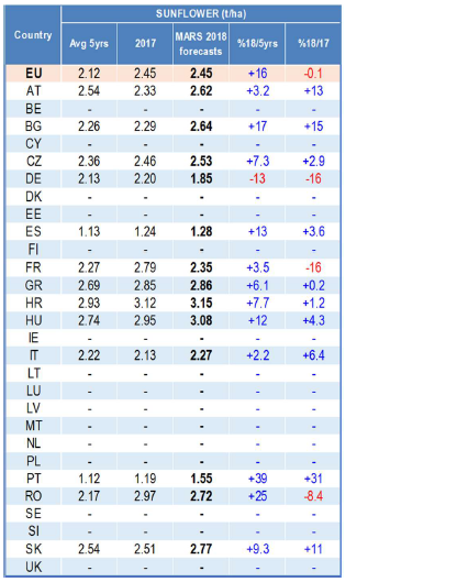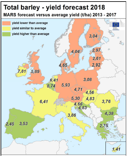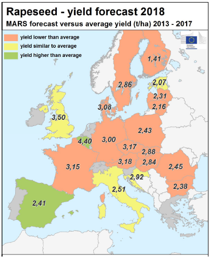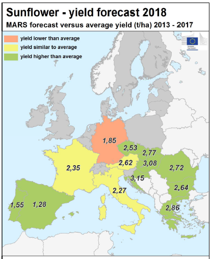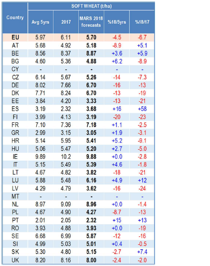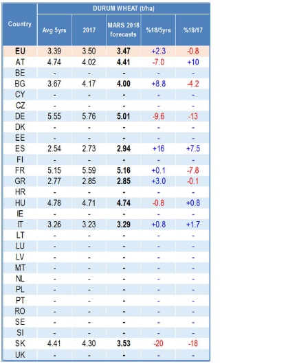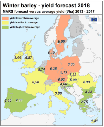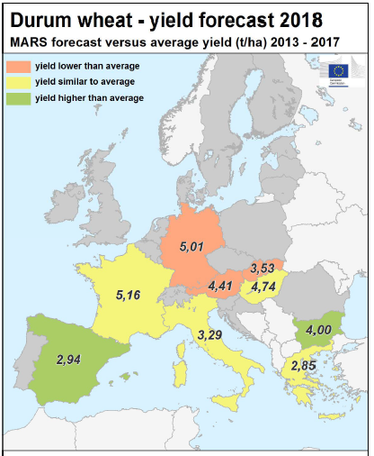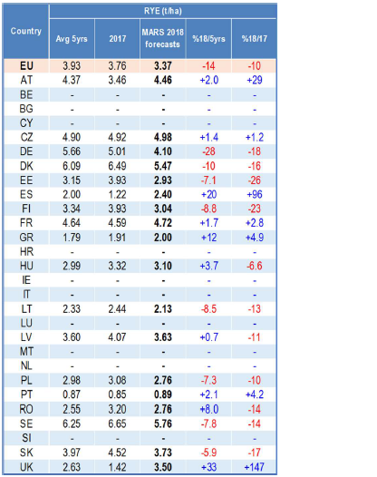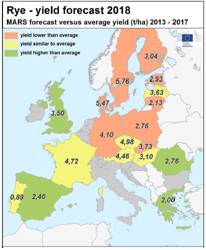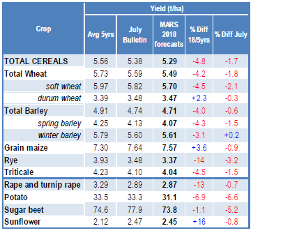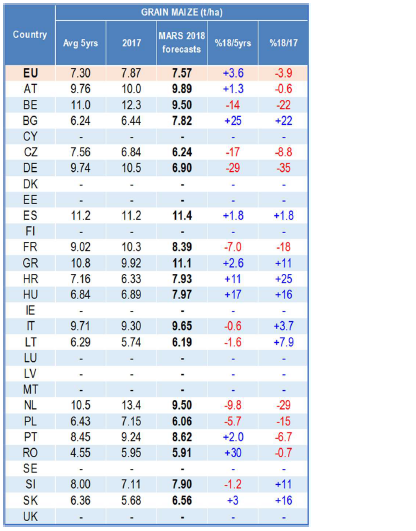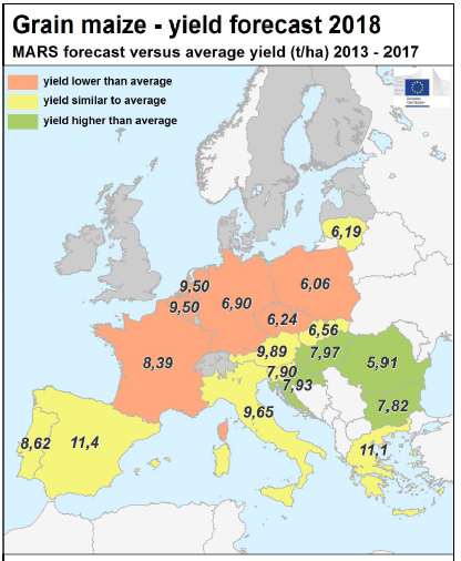 Прогнозы урожайности для озимых и яровых зерновых вновь были пересмотрены в сторону понижения на уровне ЕС, главным образом из-за сохраняющихся исключительно жарких и / или сухих погодных условий в северной и центральной Европе. Прогнозы для твердой пшеницы, озимого ячменя и рапса претерпели лишь незначительные корректировки, поскольку сбор урожая этих культур в основном был завершен к концу предыдущего периода обзора. Прогноз урожайности для кукурузы был немного снижен на уровне ЕС, но остается выше среднего показателя за 5 лет: резкие изменения в сторону понижения в Центральной Европе, а также во Франции были уравновешены сильными повышательными корректировками в юго-восточной Европе, где погодные условия были особенно благоприятными в Румынии и Болгарии.