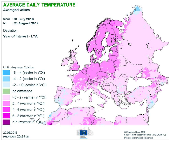 В течение рассматриваемого периода (с 1 июля по 24 августа) на большей части Европы преобладали (или продолжали преобладать) более теплые, чем обычно, погодные условия. Среднесуточные аномалии температуры (по отношению к LTA) составляли в основном между + 0,5 °C и + 4 °C. Наиболее выраженные положительные тепловые аномалии (> 2 ° C) наблюдались во Франции, странах Бенилюкса, Германии, южной Великобритании, Скандинавии, странах Балтии, Польше, Чехии и Словакии.