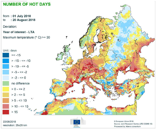 Рисунок 5. Количество жарких дней в период с 1 июля по 20 августа 2018 г, максимальная температура >30 ° C. (отклонение от долгосрочного среднего в днях).