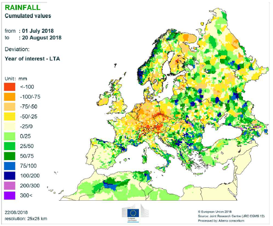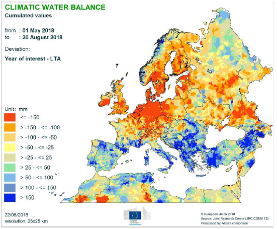 Климатический водный баланс был сильно отрицательным с начала мая в районах, прилегающих к Северному и Балтийскому морям, в северной части Центральной Европы и некоторых местах центральной и южной части России. Этот долговременный дефицит воды оказал значительное отрицательное воздействие не только на состояние посевов и пастбищ, но также привел к снижению уровня воды в водохранилищах, реках и озерах и снижению уровня грунтовых вод.