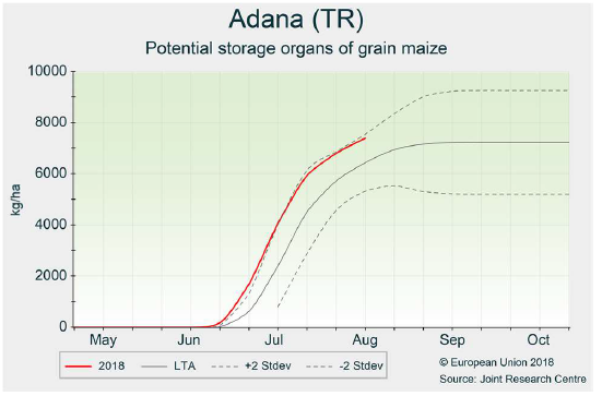 Уборка урожая озимых культур завершилась в июле при благоприятных сухих условиях. Высокие прогнозы урожайности подтверждены как для пшеницы, так и для ячменя. В июле и в первые 20 дней августа температура была близка к средней; только центральная Турция в июле и юго-восточная Турция в августе испытывали несколько более теплые, чем обычно, условия (+ 1 ° C). В основных районах выращивания кукурузы не было зафиксировано осадков: Конья, Адана и юго-восточные районы (например, Шанлыурфа). В целом, эти погодные условия были благоприятны для развития кукурузы, поскольку оно поддерживается орошением. Дожди весной и в начале лета были довольно обильными, а уровень в водохранилищах был достаточным для обеспечения оптимального роста кукурузы. В центральных и южных регионах (например, Адана) кукуруза приближается к концу фазы наполнения зерна; в юго-восточном регионе цветение кукурузы началось в начале августа.
