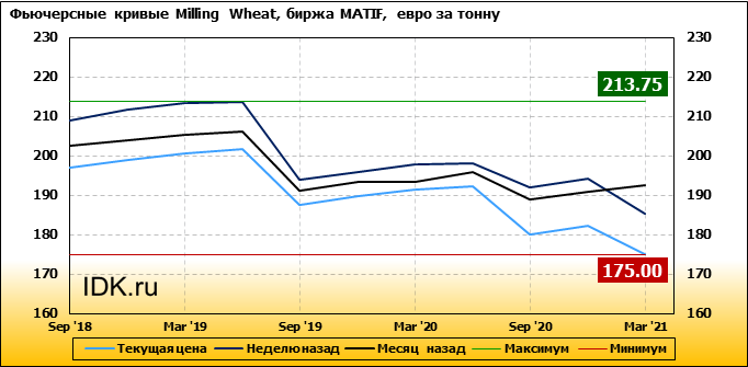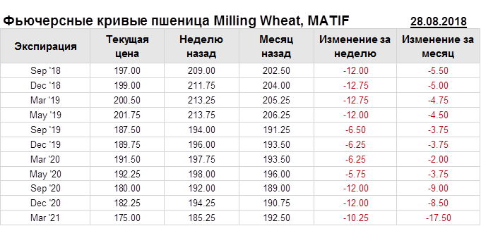 На 28.08.2018 стоимость пшеницы Milling Wheat на бирже MATIF по контракту Sep ’18 составила 197 евро за тонну. За прошедшую неделю стоимость пшеницы Milling Wheat упала на 12 евро/тонна. Как мы видим на графике, фьючерсная кривая имеет периоды, когда более дальний фьючерс дешевле ближнего. Состояние бэквардации наблюдаем на следующих контрактах: Sep ’19, Sep ’20, Mar ’21. Таким образом, трейдеры предполагают, что возможно превалирование предложения над спросом в указанные периоды.